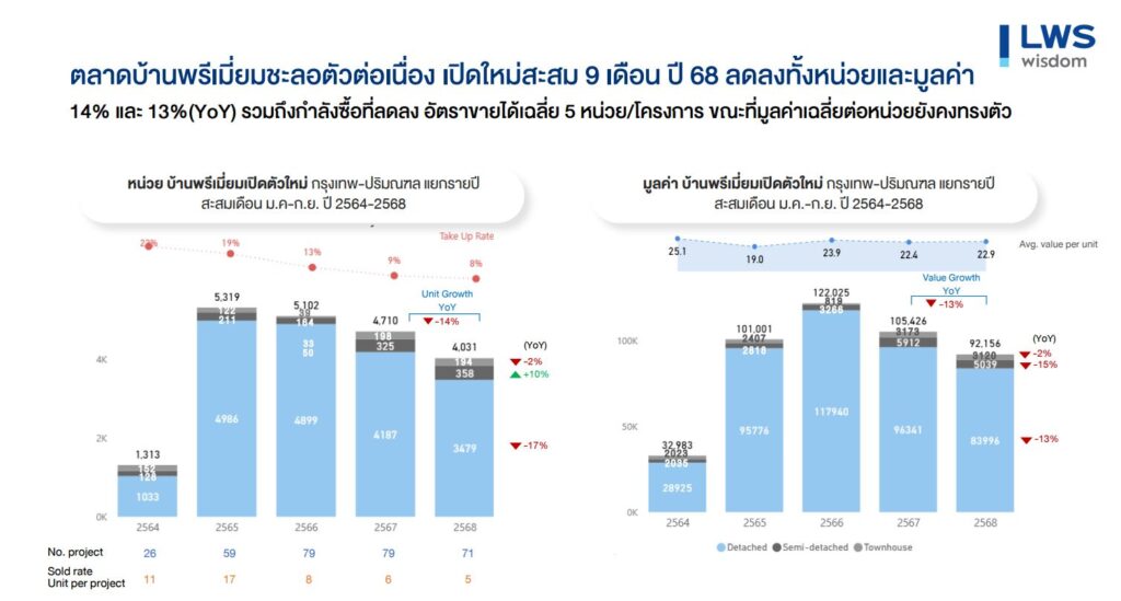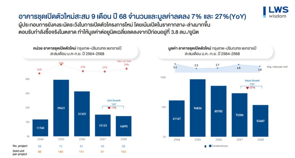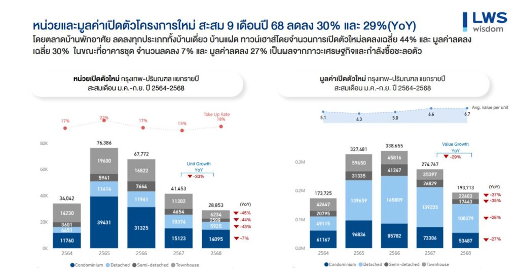 รายงานสถานการณ์ตลาดที่อยู่อาศัยเปิดตัวใหม่ในพื้นที่กรุงเทพฯ-ปริมณฑลสะสม 9 เดือนแรกของปี 2568 มีการเปิดตัวโครงการใหม่ลดลงทั้งในแง่จำนวนยูนิต และมูลค่าโครงการ โดยลดลง 30% และ 29% ตามลำดับ