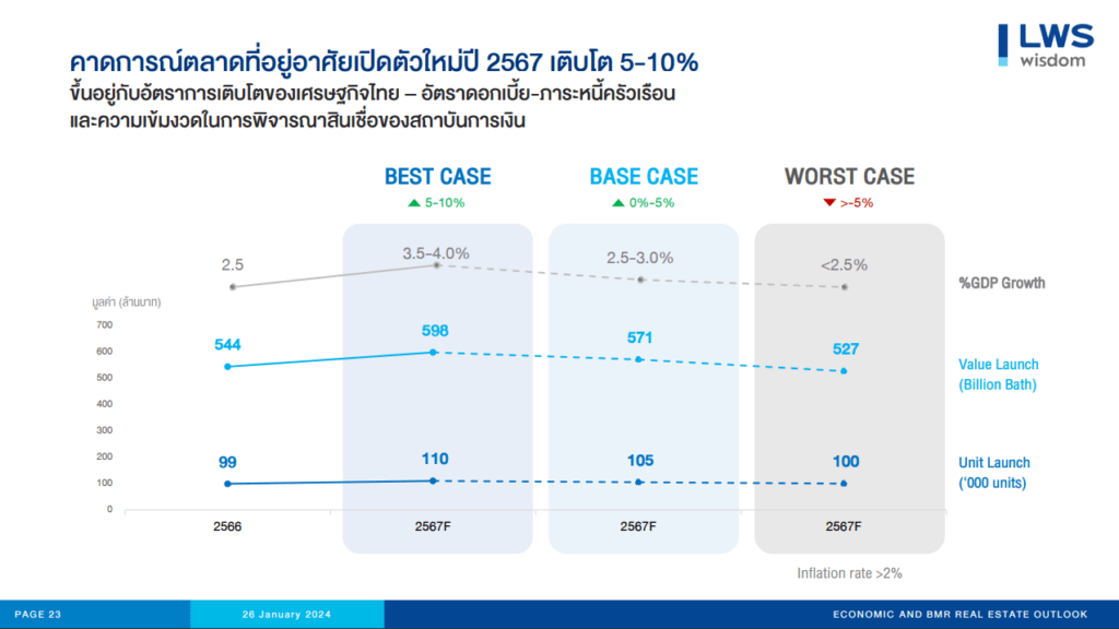 - กรณีที่ดีที่สุด (Best Case) : เป็นการคาดการณ์บนพื้นฐานจากสถานการณ์เศรษฐกิจไทยเติบโตไม่น้อยกว่า 3.5% และอัตราดอกเบี้ยคงที่หรือลดลง ภาระหนี้ครัวเรือนลดลงจาก 90% และสถาบันการเงินมีแนวโน้มการอนุมัติสินเชื่อเพื่อที่อยู่อาศัยมากขึ้น บวกกับรัฐบาลมีนโยบายกระตุ้นภาคอสังหาริมทรัพย์ ผ่อนคลายมาตรการการพิจารณาอนุมัติสินเชื่อต่อมูลค่าหลักประกัน (Loan to Value: LTV) ลดค่าธรรมเนียมการโอนและการจดจำนอง จะทำให้มีการเปิดตัวโครงการอสังหาริมทรัพย์ใหม่ในเขตกรุงเทพฯ-ปริมณฑล ในปี 2567 ประมาณ 105,000-110,000 หน่วย มูลค่าประมาณ 571,000-598,000 ล้านบาท หรือเติบโต 5-10% และอัตราการโอนกรรมสิทธิจะมีแนวโน้มเติบโตไม่น้อยกว่า 5% เมื่อเทียบกับปี 2566