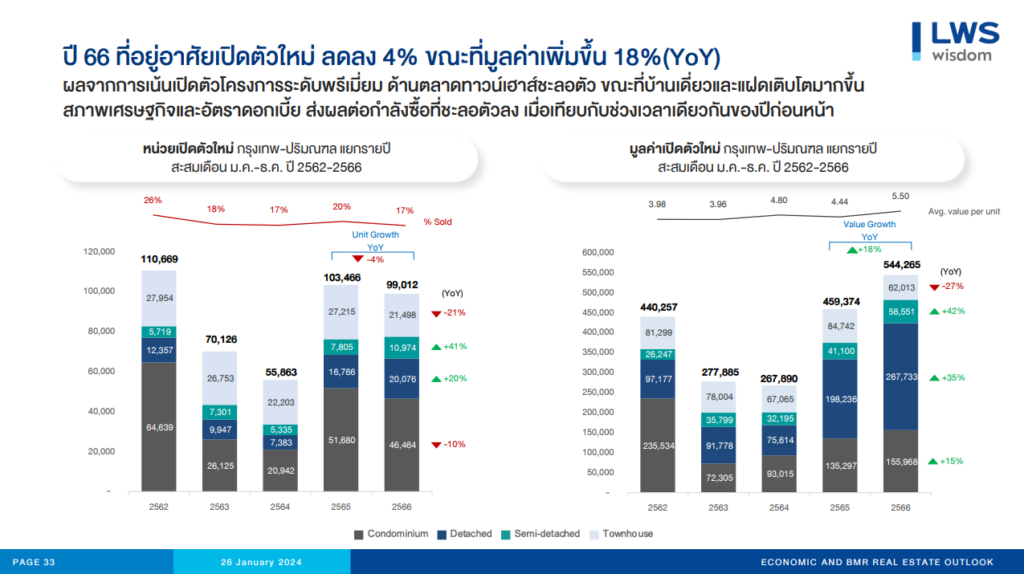 โดยในเดือน มกราคม-ธันวาคม 2566 มีจำนวนโครงการเปิดตัวใหม่ในเขตกรุงเทพฯ-ปริมณฑล ทั้งสิ้น 437 โครงการ จำนวน 99,012 หน่วย ลดลง 4% เมื่อเทียบกับจำนวนหน่วยเปิดตัว 103,466 หน่วย ในระยะเดียวกันของปี 2565 ในขณะที่มูลค่าการเปิดตัวโครงการใหม่อยู่ที่ 544,265 ล้านบาท เพิ่มขึ้น 18% จากมูลค่าเปิดตัวโครงการ 459,374 ล้านบาท ในระยะเดียวกันของปี 2565 จำนวนหน่วยเปิดตัวลดลงในขณะที่มูลค่าการเปิดตัวสูงขึ้นเนื่องจากผู้ประกอบการอสังหาริมทรัพย์ให้ความสำคัญกับการเปิดตัวที่อยู่อาศัยระดับพรีเมี่ยมที่ระดับราคาเกิน 10 ล้านบาทต่อหน่วยเพิ่มขึ้นส่งผลให้มูลค่าการเปิดตัวสูงขึ้นเมื่อเทียบกับจำนวนหน่วยเปิดตัวใหม่ลดลง โดยมีอัตราการขายเฉลี่ย ณ วันเปิดตัวที่ 17% ลดลงจากปี 2565 ที่มีอัตราการขายเฉลี่ย ณ วันเปิดตัวที่ 20%