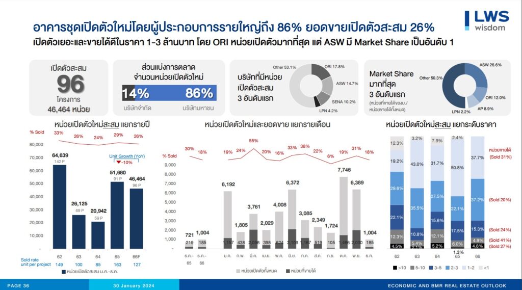 การเปิดตัวโครงการใหม่ของปี 2566 เป็นส่วนของโครงการอาคารชุดพักอาศัย 96 โครงการ คิดเป็นจำนวนหน่วยเปิดตัวใหม่ 46,464 หน่วย ลดลง 10% คิดเป็นมูลค่า 155,968 ล้านบาท เพิ่มขึ้น 15% เมื่อเทียบกับจำนวนหน่วยเปิดตัว 51,680 หน่วย และมูลค่าเปิดตัว 135,297 ล้านบาท ในระยะเดียวกันของปี 2565 โดยมีอัตราการขาย ณ วันเปิดตัวที่ 26% ลดลงจากอัตราการขาย ณ วันเปิดตัวในระยะเดียวกันของปี 2565 ที่ 29% โดยที่ราคาขายเฉลี่ยของอาคารชุดพักอาศัย ในช่วงปี 2566 อยู่ที่ 3.36 ล้านบาทต่อหน่วย เพิ่มขึ้นจากราคาขายเฉลี่ยต่อหน่วยที่ 2.62 ล้านบาท ในปี 2565