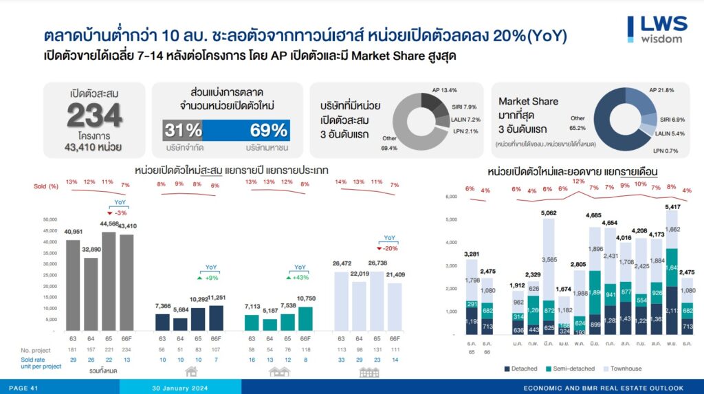 ในส่วนของการเปิดตัวโครงการบ้านพักอาศัยราคาต่ำกว่า 10 ล้านบาทจำนวน 234 โครงการ จำนวน 43,410 หน่วย ลดลง 3% เมื่อเทียบกับระยะเดียวกันของปี 2565 ขณะที่คิดเป็นมูลค่า 192,264 ล้านบาท เพิ่มขึ้น 7% เมื่อเทียบกับระยะเดียวกันของปี 2565 โดยมีอัตราการขาย ณ วันเปิดตัวโครงการที่ 7% ลดลงจากอัตราการขาย ณ วันเปิดตัวที่ 11% ของระยะเดียวกันของปี 2565 โดยมีราคาขายเฉลี่ยต่อหน่วยที่ 7.39 ล้านบาทต่อหน่วยในช่วงปี 2566 เพิ่มขึ้นจากราคาขายเฉลี่ยที่ 6.26 บาทต่อหน่วย ในช่วงปี 2565