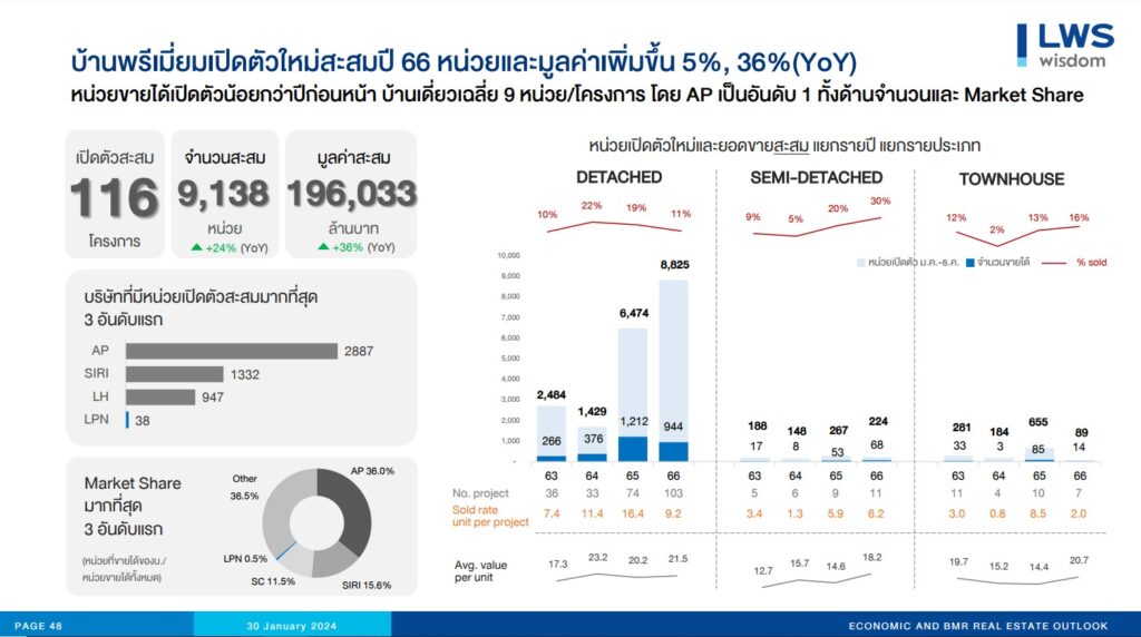 และเป็นการเปิดตัวโครงการบ้านพักอาศัยที่ระดับราคาเกิน 10 ล้านบาท จำนวน 116 โครงการ จำนวน 9,138 หน่วย เพิ่มขึ้น 24% เมื่อเทียบกับจำนวนหน่วยเปิดตัว 7,396 หน่วยในระยะเดียวกันของปี 2565 โดยมีมูลค่าการเปิดตัวโครงการใหม่ของปี 2566 ของบ้านพักอาศัยระดับราคาเกิน 10 ล้านบาทที่ 196,033 ล้านบาท หรือ เพิ่มขึ้น 36% จากมูลค่าการเปิดตัวโครงการที่ 144,246 ล้านบาท โดยมีอัตราการขาย ณ วันเปิดตัวเฉลี่ยที่ 11% ลดลงจากอัตราการขายเฉลี่ยที่ 18% ในระยะเดียวกันของปี 2565 โดยที่ระดับราคาขายเฉลี่ยของบ้านระดับราคาเกิน 10 ล้านบาทอยู่ที่ 21.5 ล้านบาทต่อหน่วย เพิ่มขึ้นจากราคาเฉลี่ยที่ 19.5 ล้านบาทต่อหน่วย ในช่วงปี 2565(หมายเหตุ : มี 9 โครงการที่มีทั้งโครงการบ้านพักอาศัยระดับราคาต่ำกว่า 10 ล้านบาทและบ้านพักอาศัยราคามากกว่า 10 ล้านบาท อยู่ในโครงการเดียวกัน ทำให้มีการนับซ้ำ)