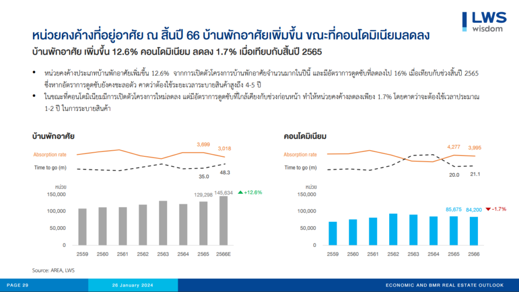การเปิดตัวโครงการจำนวนมากในปี 2566 ทำให้มีจำนวนหน่วยที่อยู่อาศัยคงค้างในเขตกรุงเทพฯ-ปริมณฑล (Inventory) ณ สิ้นปี 2566 ประเภทบ้านพักอาศัยจำนวน 145,634 หน่วย เพิ่มขึ้น 12.6% จากจำนวนบ้านพักอาศัยคงค้าง 129,298 หน่วย ณ สิ้นปี 2565 ในขณะที่คอนโดมิเนียมมีหน่วยคงค้าง 84,200 หน่วย ลดลง 1.7% เมื่อเทียบกับปี 2565 ที่มีหน่วยคงค้าง 85,675 หน่วย จำนวนหน่วยคงค้างดังกล่าวทำให้บ้านพักอาศัย ต้องใช้ระยะเวลาในการขายประมาณ 4-5 ปีและกลุ่มคอนโดมิเนียม ใช้เวลาในการขายประมาณ 1-2 ปี
