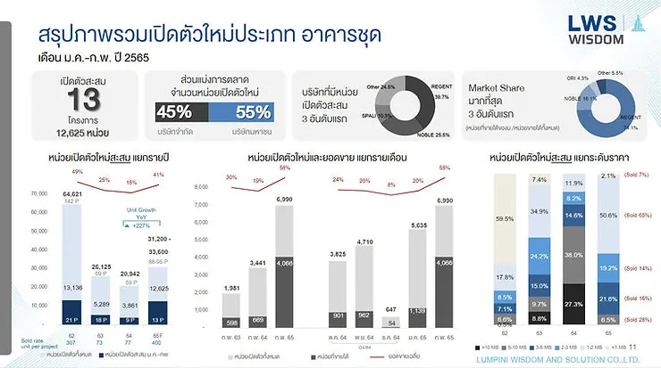 การเปิดตัวโครงการใหม่ในเขตกรุงเทพฯ-ปริมณฑล ในม.ค.-ก.พ.2565 เป็นการเปิดตัวโครงการอาคารชุดพักอาศัย จำนวน 13 โครงการ จำนวน 12,625 หน่วย เพิ่มขึ้น 227%(YoY) เมื่อเทียบกับเดือนม.ค.-ก.พ.2564 คิดเป็นมูลค่ารวม 30,247 ล้านบาท นับเป็นสัดส่วน 80% ของหน่วยเปิดตัวที่อยู่อาศัยรวมทั้งหมด โดยระดับราคาอาคารชุดพักอาศัยที่เปิดตัวมากสุดอยู่ที่ระดับราคา 1-2 ล้านบาท คิดเป็น 50.64% ของการเปิดตัวโครงการอาคารชุดพักอาศัยในเดือน ม.ค.-ก.พ. 2565เฉพาะเดือน ก.พ. 2565 เป็นการเปิดตัวโครงการอาคารชุดพักอาศัย 6 โครงการ คิดเป็นจำนวนหน่วยเปิดตัว 6,990 หน่วย โดยมีอาคารชุดพักอาศัยเปิดตัวในพื้นที่รอบนอกกรุงเทพมหานครมากขึ้น เช่น โซนบางนา และโซนรถไฟฟ้าสายสีเขียว มีการเปิดตัวโครงการที่มีจำนวนยูนิตมากกว่า 5,000 ยูนิต