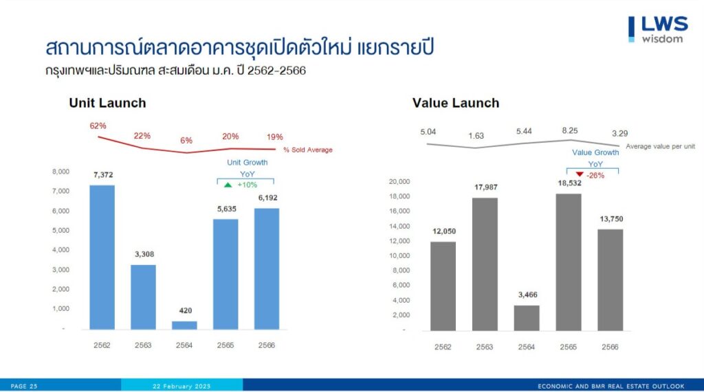 ในขณะที่การเปิดตัวโครงการอสังหาริมทรัพย์ใหม่เดือนมกราคม ปี 2566 ในเขตกรุงเทพฯและปริมณฑล มีการเปิดตัวโครงการใหม่ทั้งสิ้น 24 โครงการ คิดเป็นจำนวนหน่วยเปิดตัวโครงการใหม่จำนวน 8,329 หน่วย เพิ่มขึ้น 12% (YoY) แต่ มูลค่าการเปิดตัวโครงการใหม่ทั้งสิ้น 24,935 ล้านบาทลดลง 9%(YoY) มูลค่าที่ลดลงมาจากการเปิดตัวโครงการคอนโดมิเนียม ที่มีราคาต่ำกว่า 3 ล้านบาทมีสัดส่วนสูงขึ้น