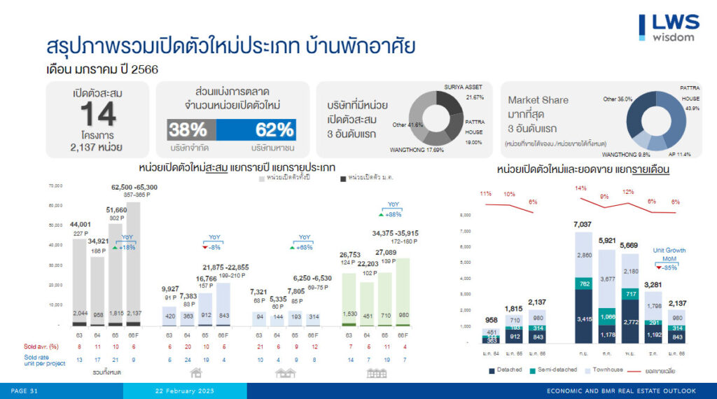 ในขณะที่เป็นการเปิดตัวโครงการบ้านพักอาศัย จำนวน 14 โครงการ จำนวน 2,137 หน่วย เพิ่มขึ้น 18% (YoY) มูลค่า 11,185 ล้านบาท เพิ่มขึ้น 25%(YoY) เมื่อเทียบกับช่วงเวลาเดียวกันในปี 2565 และมีอัตราขายเฉลี่ยอยู่ที่ 6%