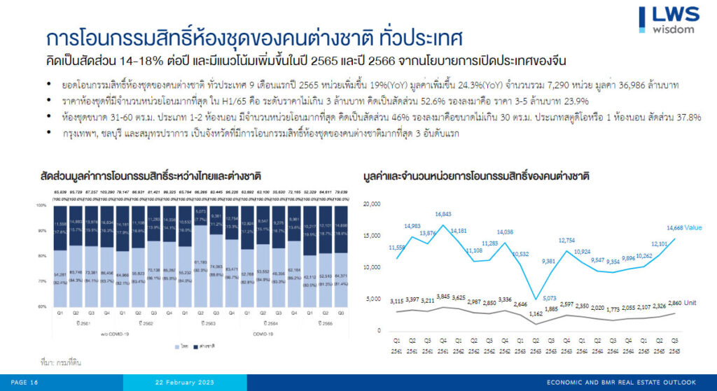 จากการรวบรวมข้อมูลการโอนกรรมสิทธิอสังหาริมทรัพย์ของชาวต่างชาติจากกรมที่ดิน ในปี 2560-2564 พบว่ามีการโอนกรรมสิทธิ์ห้องชุดของคนต่างชาติทั่วประเทศคิดเป็น สัดส่วน14-18% ต่อปีและมีแนวโน้มเพิ่มขึ้นในปี 2565 และปี 2566