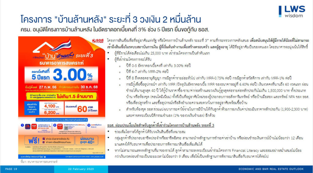 อย่างไรก็ตามในปี 2566 นอกจากความผันผวนของเศรษฐกิจไทย อัตราดอกเบี้ยที่มีแนวโน้มที่สูงขึ้นต่อเนื่องผนวกกับราคาวัสดุก่อสร้างที่มีการปรับตัวสูงขึ้นซึ่งเป็นปัจจัยเสี่ยงที่กระทบกับภาคอสังหาริมทรัพย์ก็ตาม แต่ในปี 2566 มีปัจจัยบวกที่สามารถกระตุ้นภาคอสังหาฯได้ดียิ่งขึ้น โดยอย่างยิ่งการเปิดประเทศของจีนที่จะทำให้มีการเคลื่อนย้ายเงินลงทุนจากประเทศจีนเข้ามาซื้ออสังหาริมทรัพย์ในภูมิภาคเอเซียรวมทั้งประเทศไทย ในขณะเดียวกันนโยบายของรัฐบาลสำหรับโครงการบ้านล้านหลังโดยสนับสนุนอัตราดอกเบี้ยสำหรับบ้านราคาไม่เกิน 1.5 ล้านบาท ที่อัตราดอกเบี้ย 3% เป็นระยะเวลา 5 ปี ซึ่งเป็นปัจจัยสนับสนุนการซื้อที่อยู่อาศัยในปี 2566