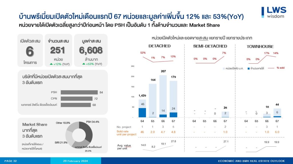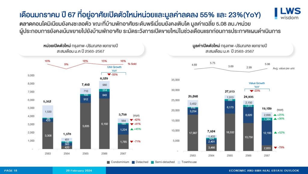 ที่อยู่อาศัยเดือนแรกปี 2567 มีโครงการเปิดตัวใหม่จำนวนลดลง 55% (YoY) มูลค่าโครงการลดลง 23% (YoY) ผลจากภาวะเศรษฐกิจชะลอตัว สถาบันการเงินเข้มงวดในการพิจารณาสินเชื่อเพื่อที่อยู่อาศัย ในขณะที่ อัตราดอกเบี้ย ภาระหนี้ครัวเรือน มีแนวโน้มสูงขึ้นส่งผลกระทบต่อภาคอสังหาริมทรัพย์