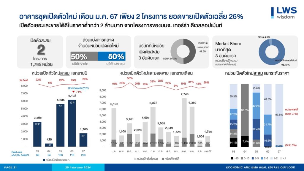 การเปิดตัวโครงการใหม่ของเดือนแรกปี 2567 เป็นส่วนของโครงการอาคารชุดพักอาศัย 2 โครงการ คิดเป็นจำนวนหน่วยเปิดตัวใหม่ 1,785 หน่วย ลดลง 71% คิดเป็นมูลค่า 2,833 ล้านบาท ลดลง 79% เมื่อเทียบกับจำนวนหน่วยเปิดตัว 6,192 หน่วย และมูลค่าเปิดตัว 13,750 ล้านบาท ในระยะเดียวกันของปี 2566 โดยมีอัตราการขาย ณ วันเปิดตัวที่ 26% เพิ่มขึ้นจากอัตราการขาย ณ วันเปิดตัวในระยะเดียวกันของปี 2566 ที่ 19% โดยที่ราคาขายเฉลี่ยของอาคารชุดพักอาศัย ในช่วงปี 2567 อยู่ที่ 1.59 ล้านบาทต่อหน่วย ลดลงจากราคาขายเฉลี่ยต่อหน่วยที่ 2.22 ล้านบาท ในปี 2566