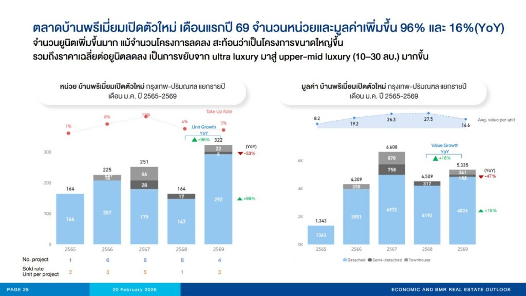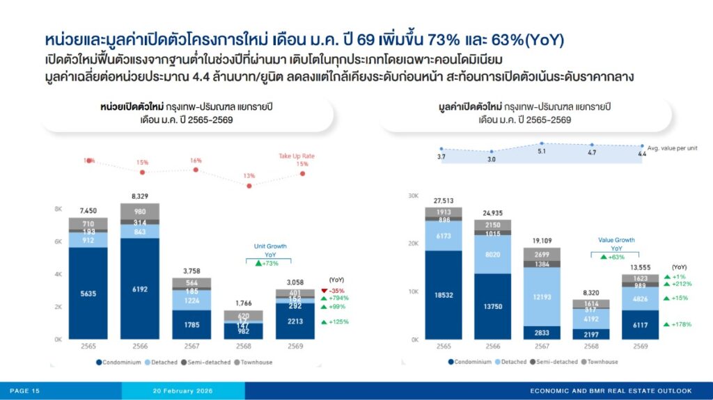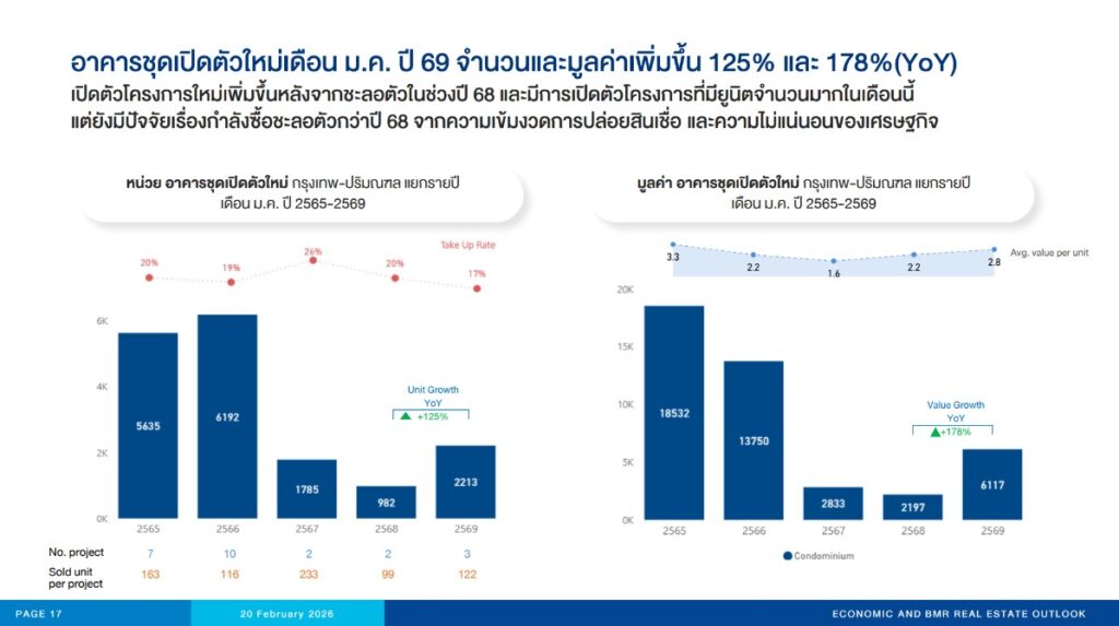 ตลาดอสังหาริมทรัพย์ในพื้นที่กรุงเทพฯ–ปริมณฑล เดือนแรกปี 2569 เปิดตัวเพิ่มขึ้นทั้งจำนวนหน่วยและมูลค่า ฟื้นตัวชัดเจนจากฐานเมื่อเทียบกับช่วงเวลาเดียวกันของปี 2568 ที่ชะลอการเปิดตัวลงอย่างมีนัยสำคัญ อย่างไรก็ตาม การฟื้นตัวครั้งนี้ยังอยู่ท่ามกลางโจทย์ใหญ่ของเศรษฐกิจเติบโตต่ำ หนี้ครัวเรือนระดับสูง และความเข้มงวดของสถาบันการเงินในการปล่อยสินเชื่อ ซึ่งจะเป็นตัวกำหนดจังหวะตลาดตลอดทั้งปี