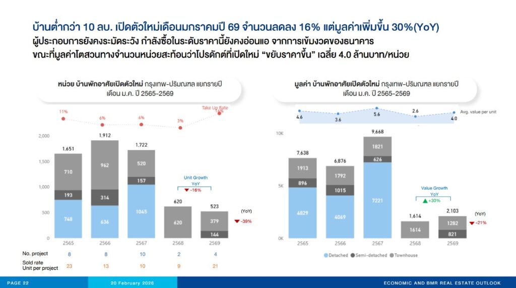 ตลาดบ้านพักอาศัย ระดับราคาต่ำกว่า 10 ล้านบาท มีการเปิดตัวโครงการใหม่ เดือนมกราคม ปี 2569 ในประเภททาวน์เฮาส์ และบ้านแฝด โดยไม่มีการเปิดตัวประเภทบ้านเดี่ยวเลย โดยเปิดตัวใหม่ทั้งหมด 4 โครงการ เพิ่มขึ้น 100% จำนวน 523 หน่วย ลดลง 16% คิดเป็นมูลค่า 2,103 ล้านบาท เพิ่มขึ้น 30% เมื่อเทียบกับช่วงเวลาเดียวกันของปี 2568 ซึ่งมีโครงการเปิดตัวใหม่ 2 โครงการ จำนวน 640 หน่วย คิดเป็นมูลค่า 1,614 ล้านบาท โดยโครงการเปิดตัวใหม่ เดือน มกราคม ปี 2569 มีอัตราการขายได้ ณ วันเปิดตัว อยู่ที่ 16% เพิ่มขึ้นจากช่วงเวลาเดียวกันของปี 2568 ซึ่งมีอัตราการขายได้เฉลี่ยเพียง 3%