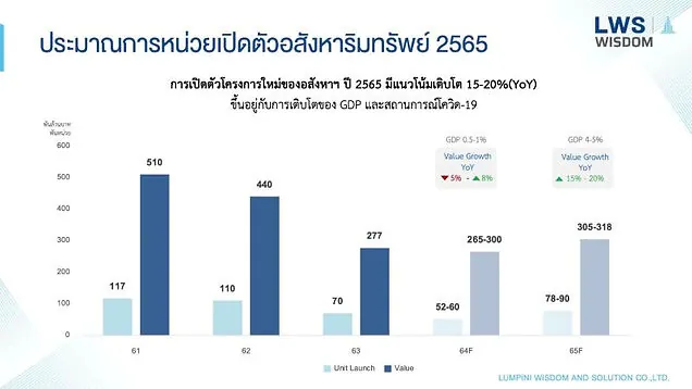 จากแนวโน้มดังกล่าวทีมวิจัยของ LWS คาดการณ์ว่า ในปี 2565 จะมีการเปิดตัวโครงการใหม่ในเขตกรุงเทพฯ และปริมณฑล ประมาณ 78,000 – 90,000 หน่วย คิดเป็นมูลค่า 305,000 – 318,000 ล้านบาท โดยเพิ่มขึ้นประมาณ 15 – 20% เมื่อเทียบกับปี 2564 เนื่องจากผู้ประกอบการเริ่มมีความมั่นใจ ทำให้ทยอยเปิดตัวโครงการที่ถูกเลื่อนการเปิดตัวในปี 2564 มาเปิดตัวในปี 2565 รวมถึงแผนเปิดตัวโครงการใหม่ที่เพิ่มขึ้นในปี 2565