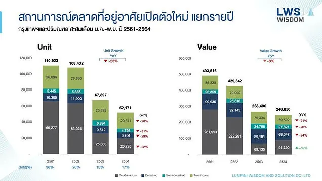 ตลาดที่อยู่อาศัยปี 2564 หดตัว 20 % ในขณะที่การคาดการณ์การเปิดตัวโครงการที่อยู่อาศัยในเขตกรุงเทพฯ และปริมณฑล ในปี 2564 อยู่ที่ประมาณ 53,000 – 55,000 หน่วย คิดเป็นมูลค่าประมาณ 265,000 – 300,000 ล้านบาท เป็นส่วนของแนวราบทั้งบ้านเดี่ยว ทาวน์เฮาส์ บ้านแฝด ประมาณ 33,000 – 35,000 หน่วย คิดเป็นมูลค่า 166,000 – 188,000 ล้านบาท ลดลงจากปี 2563 ประมาณ 10% – 20% และเป็นส่วนของการเปิดตัวโครงการคอนโดมิเนียม คาดว่าจะมีหน่วยเปิดตัวใหม่ในปี 2564 ประมาณ 20,000 – 22,000 หน่วย คิดเป็นมูลค่า 99,000 – 112,000 ล้านบาท ลดลงจากปี 2564 16% – 23% โดยตัวเลขการเปิดตัวโครงการใหม่ในเขตกรุงเทพฯ และปริมณฑล ในเดือน มกราคม – พฤศจิกายน 2564 มีจำนวน 52,171 หน่วย ลดลง 23% เมื่อเทียบกับระยะเดียวกันของปี 2563 เป็นการเปิดตัวโครงการคอนโดมิเนียม 20,295 หน่วย มีอัตราการขายเฉลี่ยอยู่ที่ 23% และการเปิดตัวโครงการแนวราบ 31,876 หน่วย อัตราการขายเฉลี่ยอยู่ที่ 13% โดยในเดือนพฤศจิกายน 2564 มีการเปิดตัวโครงการใหม่สูงสุดของปี 2564 โดยมีการเปิดตัวโครงการใหม่ในเขตกรุงเทพฯ และปริมณฑล 11,648 หน่วย มูลค่า 52,185 ล้านบาท (คิดเป็นสัดส่วน 22.32% ของจำนวนหน่วยเปิดตัวทั้งหมดในเดือนมกราคม – พฤศจิกายน 2564)