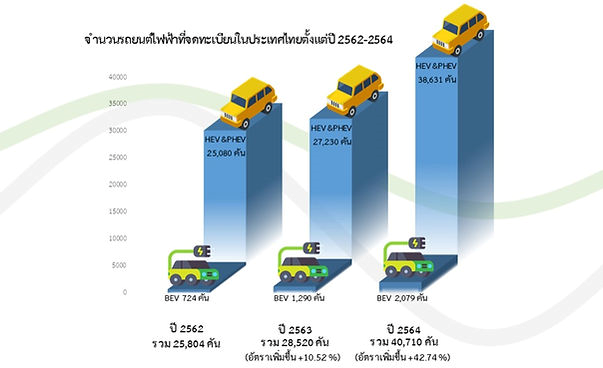 จากรายงานของกรมการขนส่งทางบก ระบุว่า นับตั้งแต่ปี 2562-2564 มีจำนวนรถยนต์ไฟฟ้าทั้งแบบ HEV (Hybrid Electric Vehicle), BEV (Battery Electric Vehicle), และ PHEV (Plug-in Hybrid Electric Vehicle) จดทะเบียนในประเทศรวมทั้งสิ้น 95,034 คัน เฉพาะปี 2564 มีจำนวนยอดจดทะเบียนรถไฟฟ้าทั้ง HEV, BEV, PHEV ทั้งสิ้น 40,710 คัน เติบโต 43%