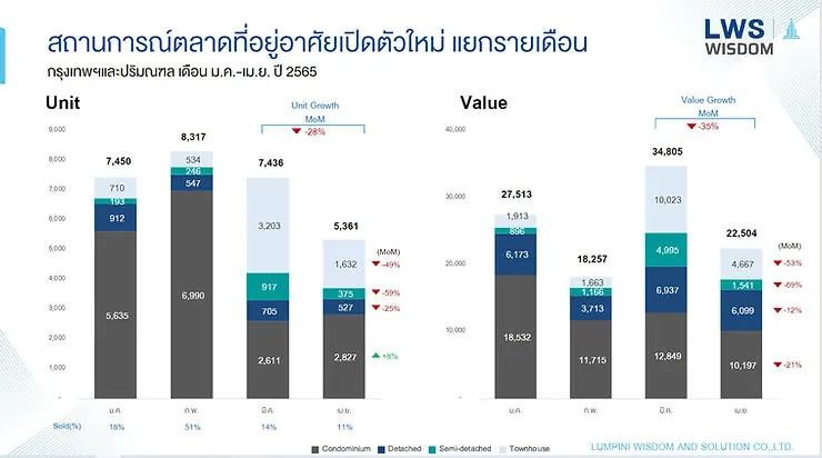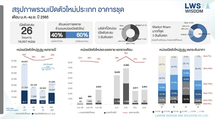 ผลการวิจัยตลาดอสังหาริมทรัพย์กรุงเทพฯ-ปริมณฑลสะสมเดือน ม.ค.-เม.ย. 2565 มีจำนวนที่อยู่อาศัยเปิดตัวใหม่ทั้งสิ้น 28,564 หน่วย เพิ่มขึ้น 120% เมื่อเทียบกับหน่วยสะสมของปี 2564 และมีมูลค่าการเปิดตัวโครงการใหม่รวม 103,078 ล้านบาท แบ่งเป็นการเปิดตัวคอนโดมิเนียมมีหน่วยเปิดตัวใหม่เพิ่มขึ้น 208%(YoY) จำนวน 26 โครงการ 18,067 หน่วย มูลค่า 53,293 ล้านบาท เพิ่มขึ้น 10%(YoY) เมื่อเทียบกับช่วยเดียวกันในปี 2564 และมีอัตราขายเฉลี่ยอยู่ที่ 32% นับเป็นสัดส่วน 63% ของหน่วยเปิดตัวที่อยู่อาศัยทั้งหมด
