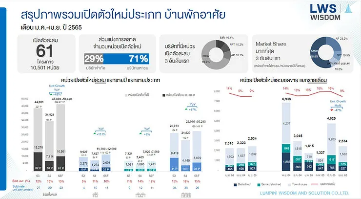 ในขณะที่มีการเปิดตัวโครงการบ้านพักอาศัย มีหน่วยเปิดตัวใหม่เพิ่มขึ้น 48%(YoY) จำนวน 61 โครงการ จำนวน 10,501 หน่วย มูลค่า 49,785 ล้านบาท เพิ่มขึ้น 61%(YoY)เมื่อเทียบกับช่วงเวลาเดียวกันในปี 2564 และมีอัตราขายเฉลี่ยอยู่ที่ 13%