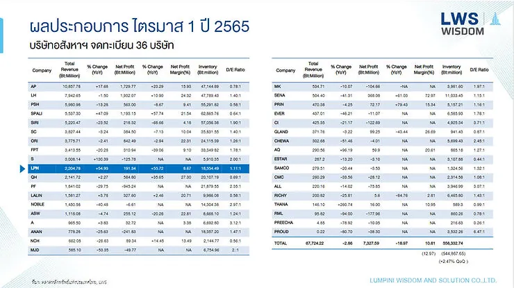 ขณะที่ผลประกอบการบริษัทอสังหาฯ ที่จดทะเบียนในตลาดหลักทรัพย์แห่งประเทศไทย ไตรมาส 1/65 รายได้รวมและกำไรลดลง โดยที่รายได้รวมอยู่ที่ 67,724.22 ล้านบาท กำไรสุทธิ 7,327.59 ล้านบาท ลดลง 2.86%(YoY) และ 18.97%(YoY) ตามลำดับ และความสามารถในการทำกำไรเฉลี่ย 10.81% ลดลงจาก 12.97% ในระยะเดียวกันของปี 2564 ในขณะเดียวกันสินค้าคงเหลือและที่อยู่ระหว่างการก่อสร้าง เพิ่มขึ้น 2.47% ผลจากการเร่งเปิดตัวโครงการของผู้ประกอบการอสังหาริมทรัพย์ ในไตรมาสแรก 2565 หลังจากที่ชะลอเปิดตัวโครงการในช่วงไตรมาสสุดท้ายของปี 2564